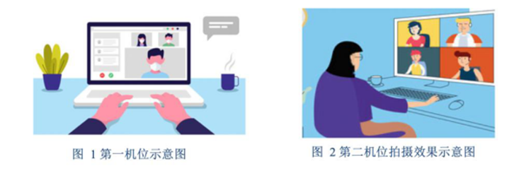 2.“双机位”摆放要求:第一机位为主机位,从正面拍摄,放置在距离本人30cm左右处,用于考官对考生的远程视频考核(最好为笔记本电脑)。第二机位为副机位(监考机位),放于考生侧后方45°处拍摄,确保第一机位和第二机位分别从考生面前和身后完整拍摄到考生全身、复试小组能够从第二机位清晰看到第一机位屏幕。效果图如下: