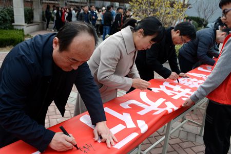 仪式接近尾声,老师与同学们在横幅上有序进行签字仪式。