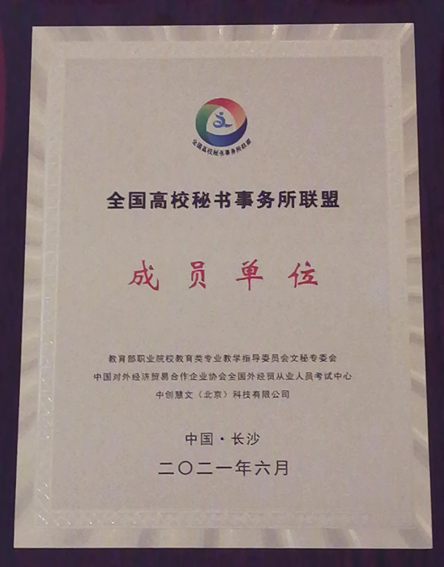 2019年3月,在教育部职业院校教育类专业教学指导委员会文秘专委会指导下,由安徽商贸职业技术公司、中创慧文(北京)科技有限公司、南宁职业技术公司、广东科学技术职业公司等17家单位共同发起并成立的服务于秘书专业教育的公益性组织。目前,包括公司(BEAT365英国官网网站)在内的全国高校秘书事务所联盟院校成员数量已达37所。