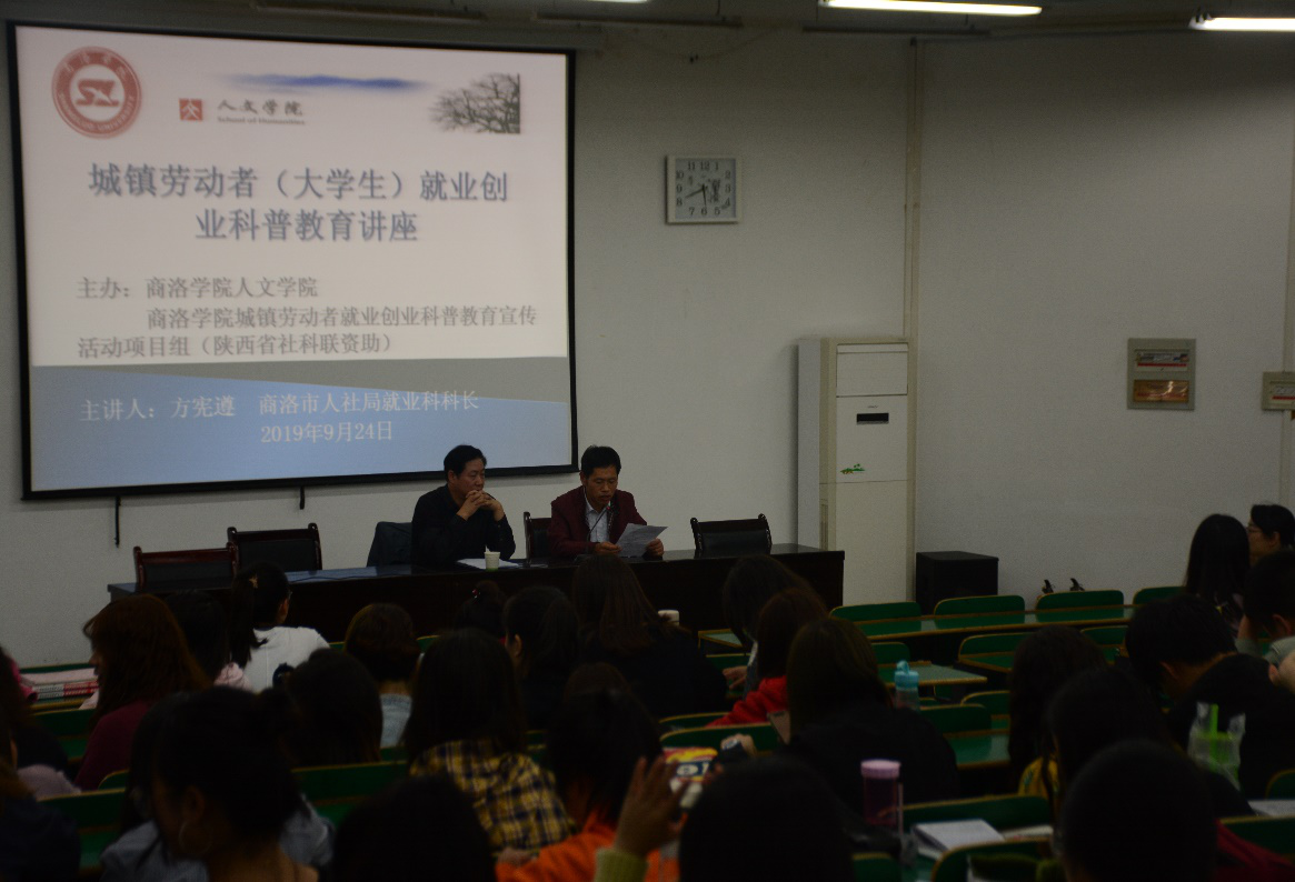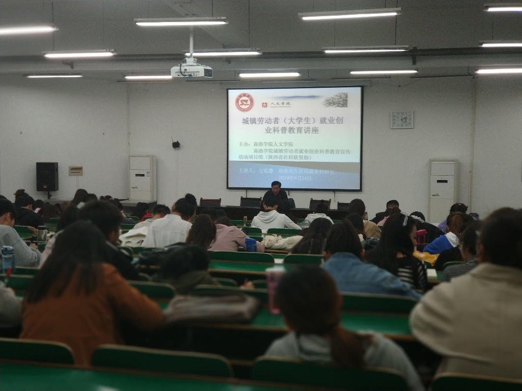 9月24日下午,beats365唯一官方网站《城镇居民及老员工就业创业科普教育》课题组邀请商洛市人社局就业科方宪遵科长在1号楼报告厅为公司师生做就业创业专题讲座,100多名师生参加了活动。