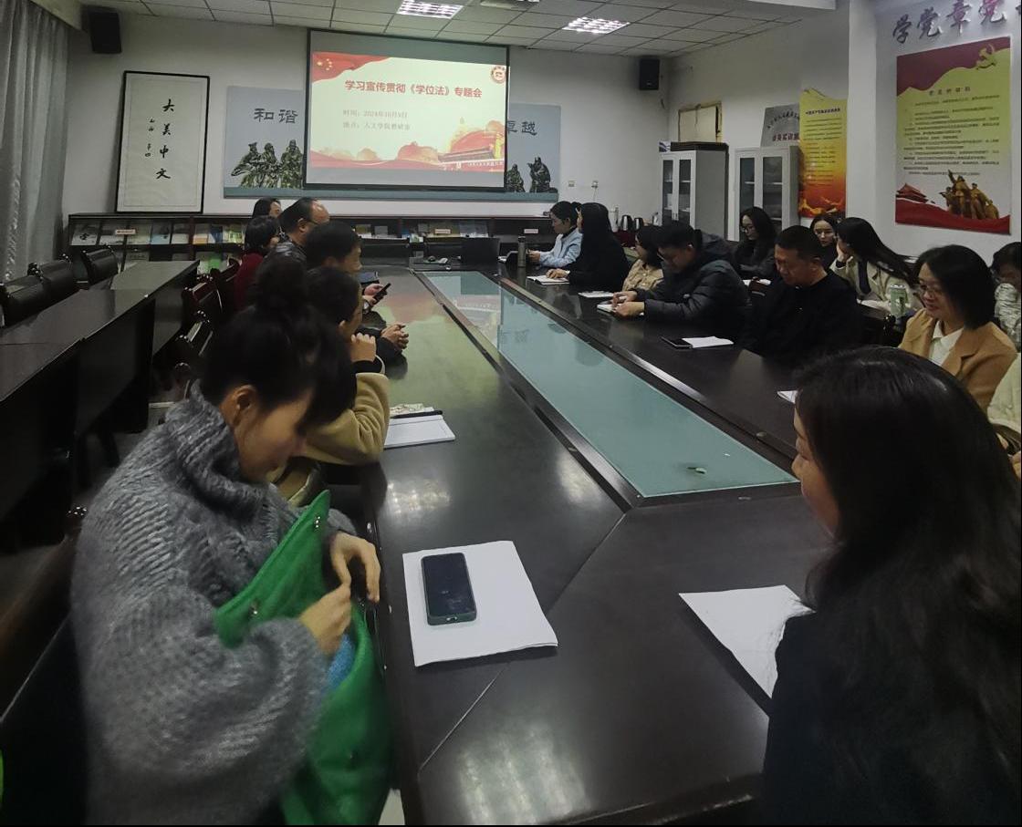 为全面贯彻落实党的二十届三中全会精神和全国教育大会精神,深刻领悟《学位法》颁布的重大意义,公司于10月9日下午在1号教学楼206会议室召开《中华人民共和国学位法》专题学习会议,公司全体领导班子成员以及教师代表参加了会议。