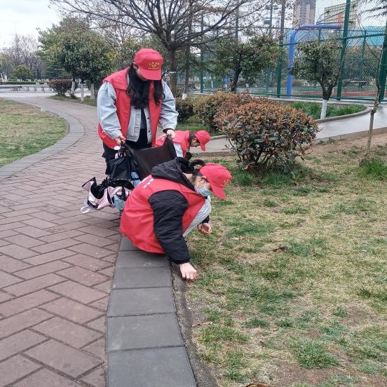 志愿者们按照事先的分组安排,分别在不同的区域捡垃圾、宣传环保知识。杨柳,河堤,春风,细雨,春天的绿色似乎和红色的马甲格外相配。小雨过后,空气中都是泥土的清香,志愿者们蹲下拾起地上的垃圾,给大地穿上新的绿衣。我们给你一个干净的家,小花小草快快长大。