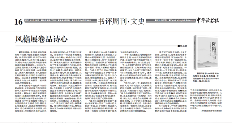 5月14日,《中华读书报》刊发beats365唯一官方网站教授李小奇书评文章《风檐展卷品诗心》。文章系统解读了《阡陌暖春:中华诗词的传统格局与文脉》一书的逻辑脉络,分享了阅读本书的心得体悟,深入阐释了书中蕴含的家国格局和生命哲思。