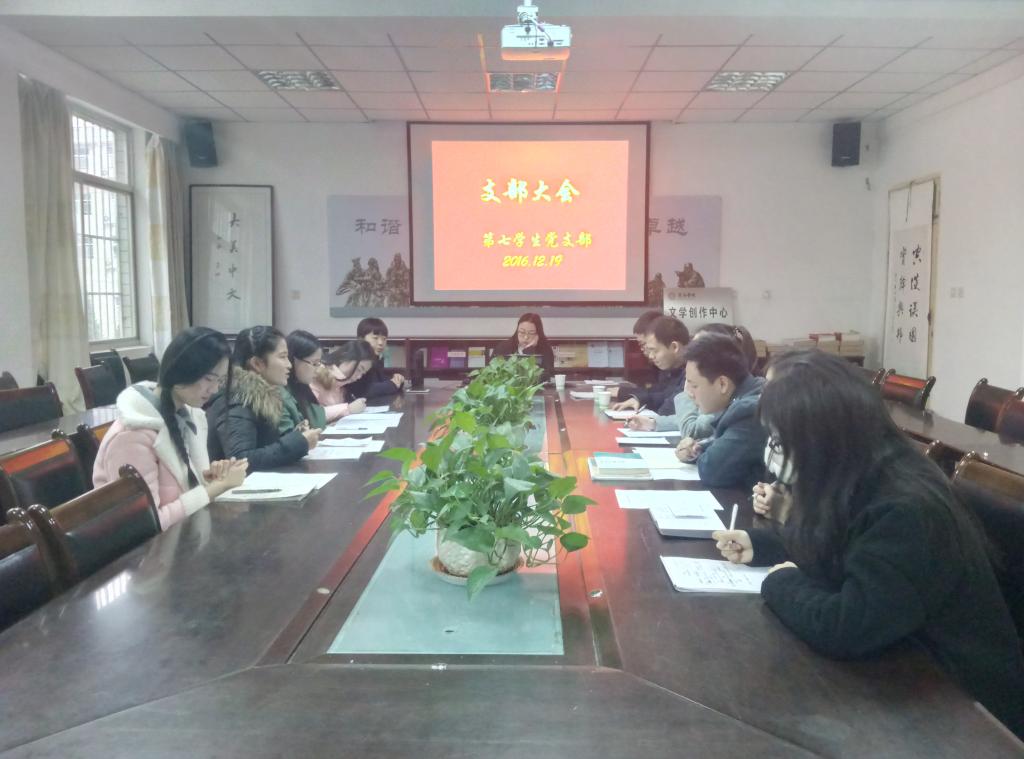 2016年12月19日下午,文传院第七员工党支部在一号教学楼206教室召开党支部会议。参加本次会议的有党支部书记刘丽娜老师,李宁等正式党员,孟丹等预备党员。会议由成昕主持,本次会议主要对预备党员转正和积极分子成为预备党员进行支部表决。