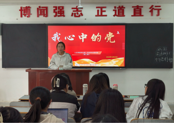 党员袁铭、马梅梅等同学依次上台,分享了她们对党的认识与感悟。袁铭同学认为,中国共产党就是一座灯塔,她的存在让我看到了希望,感受到了温暖,也教会了我什么是真正的良心。每当我遇到困惑或挫折,想到那些在历史上留下浓墨重彩一笔的共产党人,就会感受到一股巨大无形的力量,激励我继续前进。马梅梅同学表示,新时代的广大青年要自觉担负起时代的重任,不惧风雨、勇挑重担,在为人民服务中茁壮成长,在艰苦奋斗中砥砺意志品质、在实践中增长工作本领,在时代的征程中不懈奋进,在祖国的万里长空放飞梦想,在为人民利益的奋斗中书写人生华章!